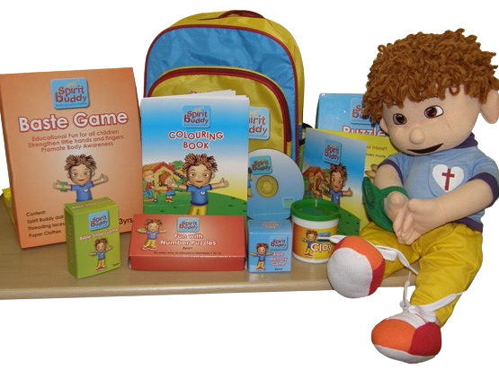 - Deur die Spiritbuddy storieboek te lees, sit jou kind met Spiritbuddy (pop) op die skoot. Soos daar gelees word in die boekie word al die aksies deur jou kind met Spiritbuddy uitgevoer byvoorbeeld die hartjie wat met velcro oop en toe maak- leer van sonde en vryspraak. Deur die ritsluiter oop te maak, is daar ‘n “Bybel” daarbinne wat hul leer van hoe om te groei in die geloof. Die hande met velcro leer jou kind om te bid- juis vanuit die boekie en hul word ook geleer van sending.